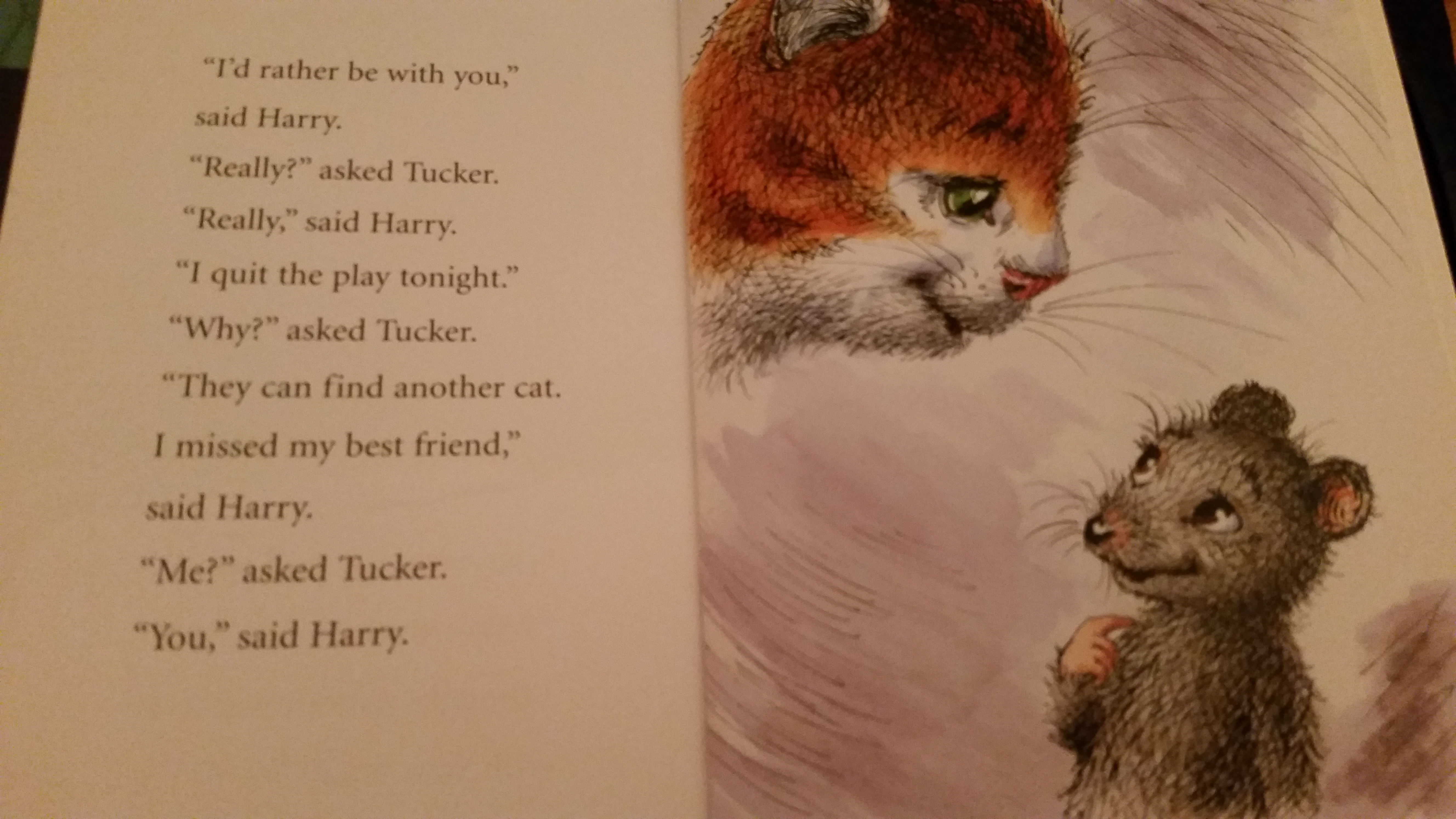 Then it was my turn to read a story with Young A. He dismisses so many of my favorite books out of hand now. “Those are for toddlers,” he said tonight, witheringly. I managed to find one we hadn’t read in a while, a derivative work, but with cute illustrations and a tale of friendship and loyalty. I just didn’t realize how much it would relate to my conversation with Young J about my job, until we got to this page: