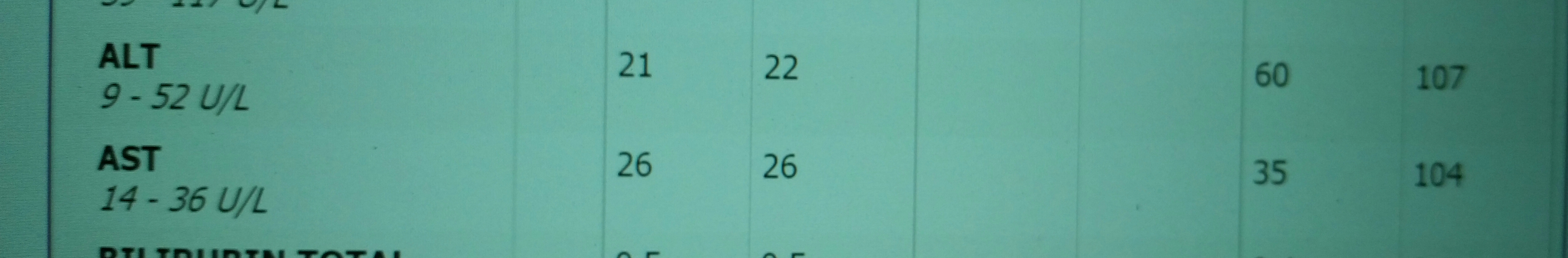 Nurse Practitioner K got to break the good news today – my liver numbers went down! As of today. In case you don’t know what that looks like, here they are and what they looked like as of last week: