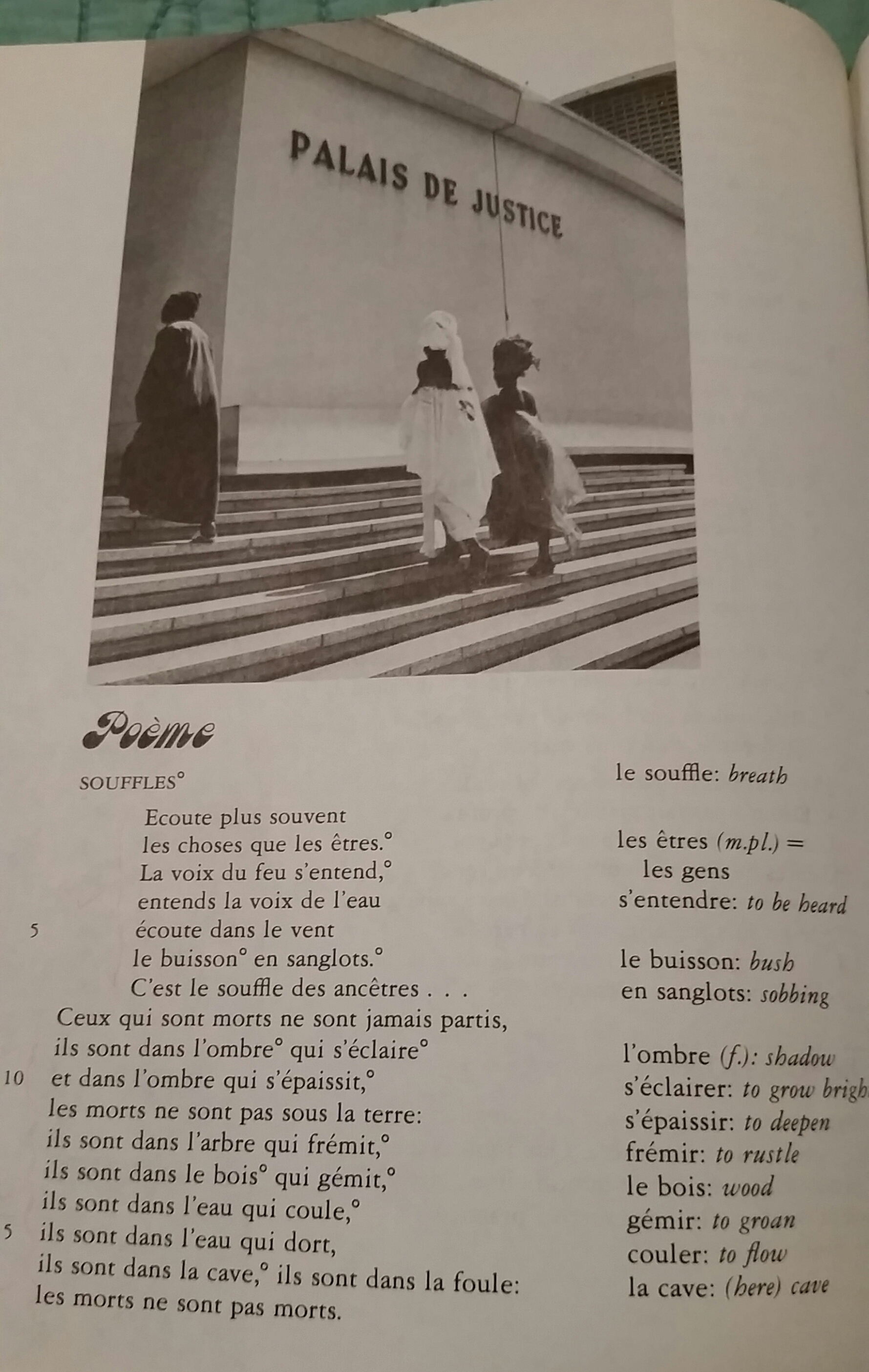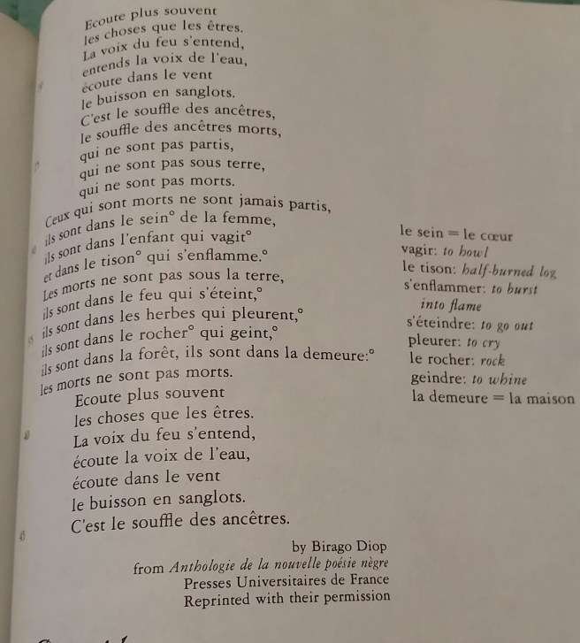 There was no biographical note about the author. There was just the poem, and my assumption that the author came from Francophone Africa. I loved the poem so much, I not only memorized it — I also, at the end of the school year, bought my copy of the textbook. I have toted it around with me ever since, even to college, where as a French and Italian major, I mostly had no actual textbooks, just small, obscenely expensive imported paperbacks of novels to read, or sheaves of photocopied poetry or plays or literary criticism hand-selected by my professors.